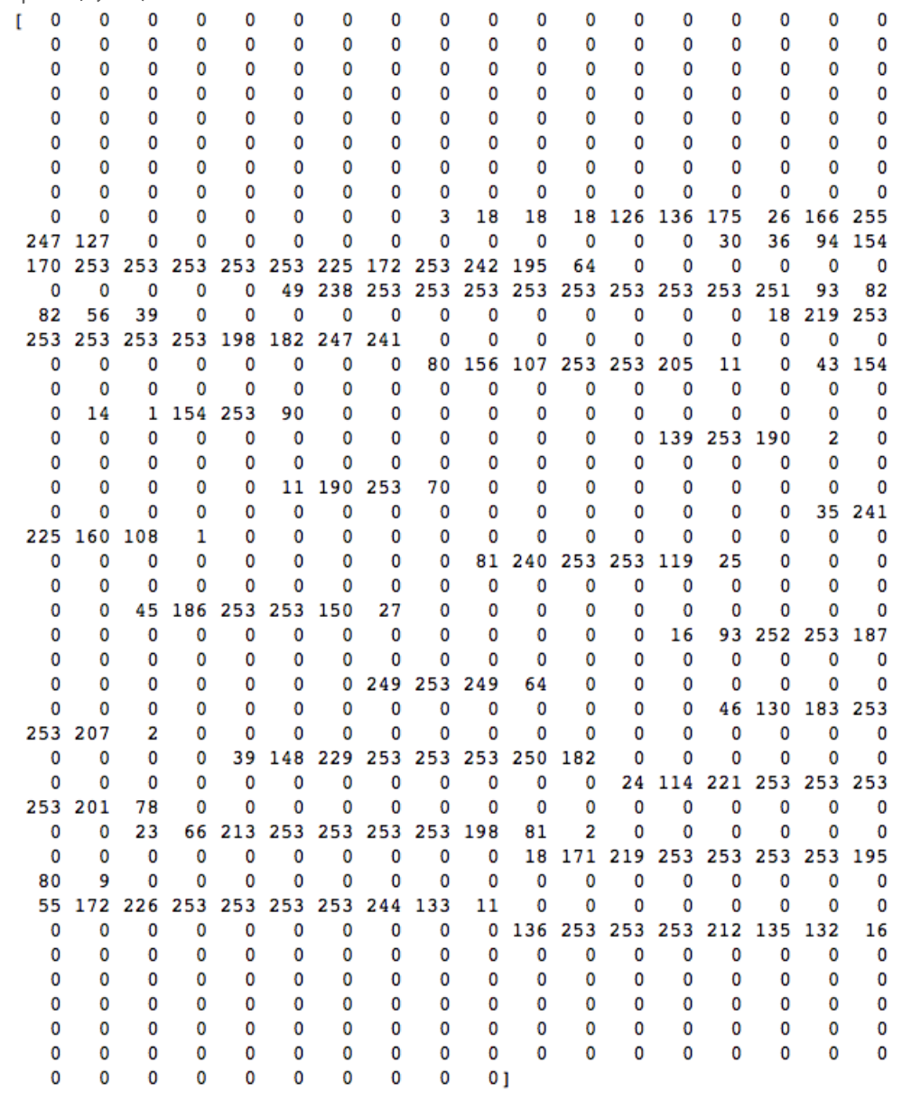 손글씨로 쓴 숫자 5의 이미지이다. 이미지를 넘파이 배열로 변환하여 학습시킬 것이다. 해당 이미지는 28 * 28 사이즈로, 픽셀별로 쪼개어 배열로 만든다. 회색조 이미지에서 각 픽셀은 색상에 따라 0에서 255까지의 값을 취한다. 위 이미지를 배열로 만들면 아래와 같으며 배열의 shape는 (1,784)이다.