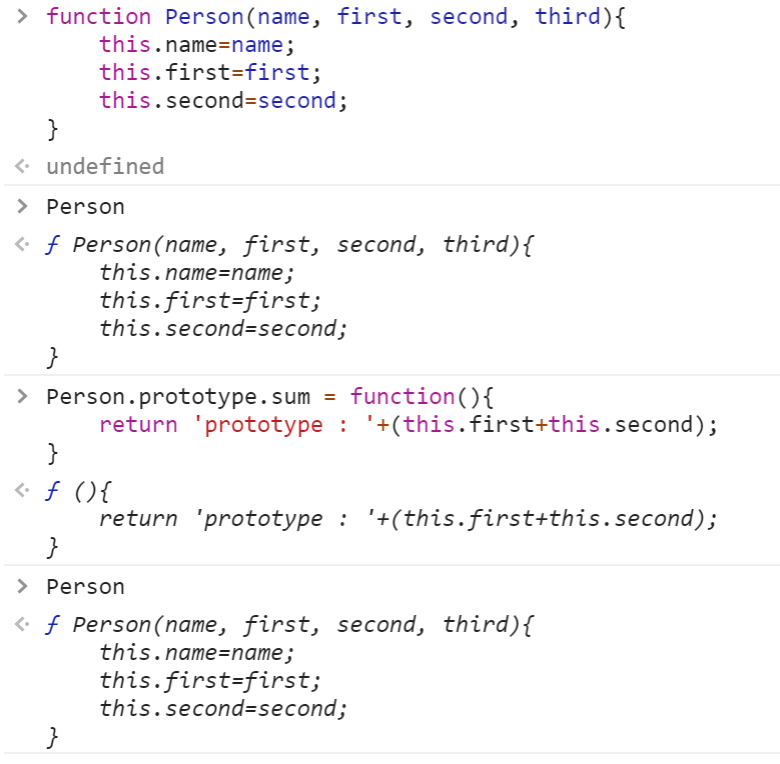 위 코드처럼 prototype을 사용해 sum 함수를 정의하면 된다. 그런데 저렇게 하면 Person에 sum()이 추가돼서 똑같아지는 거 아닌가 생각했는데, 확인해보니 아래와 같았다.